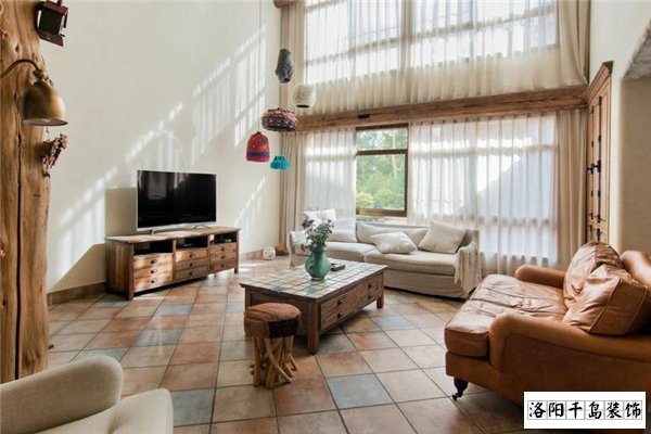 客廳的復(fù)古一半源于硬裝,一半源于軟裝。