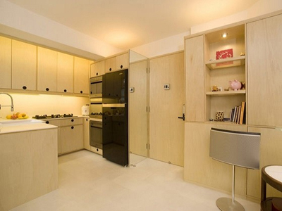 開放式的廚房能節(jié)省不少空間,蘋果綠色很漂亮,桌靠墻擺放 留出的過(guò)道恰恰好。
