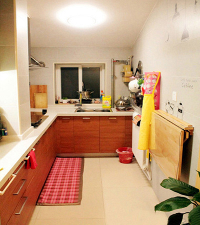 L形的廚房,玻璃的移門。做飯時(shí)還能拉上門簾。