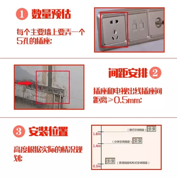 客廳與臥室的插座,應(yīng)保證每個(gè)主要墻面均有一個(gè)5孔插座,以滿足日常生活所需。插座的位置應(yīng)根據(jù)房屋的設(shè)計(jì)來(lái)確定,如電視背景墻位置的插座可適當(dāng)多一些,其他位置的根據(jù)需要而定。