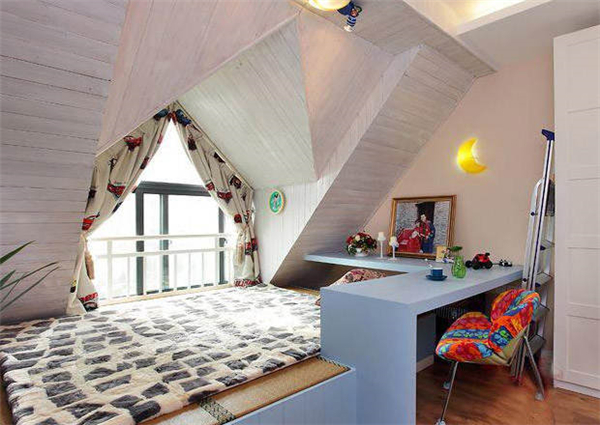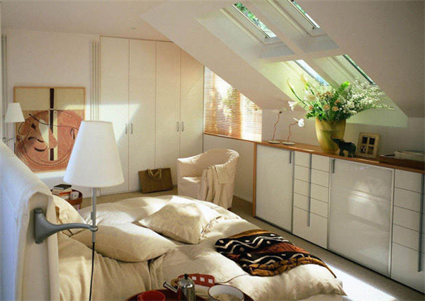 在斜房頂間的閣樓裝修上,就可以在矮的那邊就可以放上榻榻米,完全就不用怕頭碰著上方,在加上一個溫暖的壁燈,不僅能夠照明還能夠作為一個很好的裝飾。