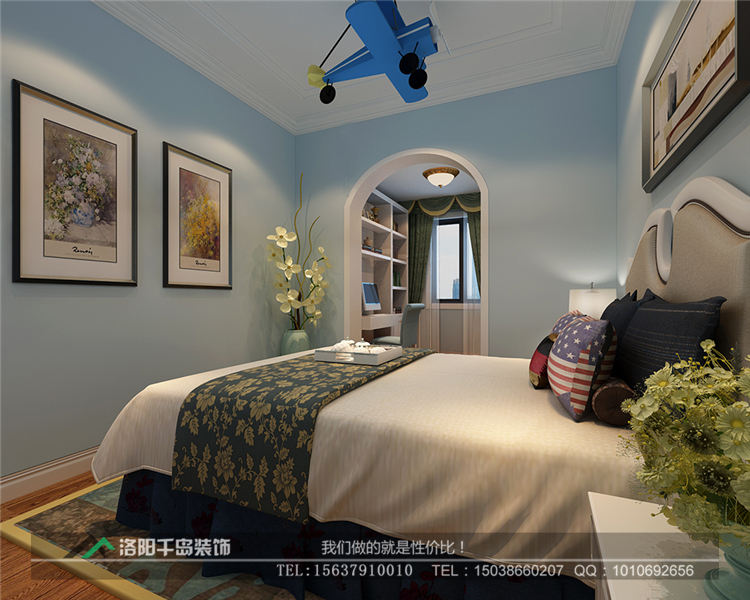歐式兒童房,清爽的顏色搭配,讓整個(gè)房間更加清新自然。讓人仿佛置身于北歐的森林中。簡(jiǎn)約清新的飛機(jī)吊燈設(shè)計(jì),讓房間在利用上變得更加靈活。