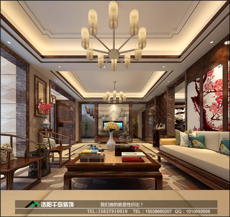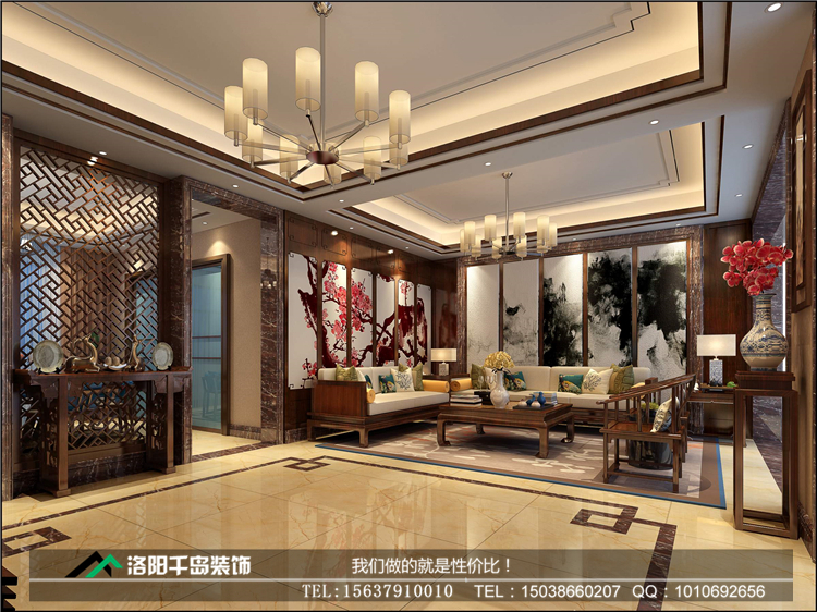 洛陽開元名郡225㎡復(fù)式新中式裝修案例@一樓客廳