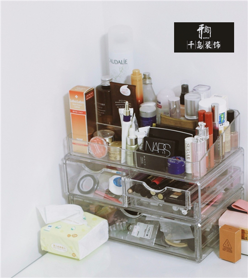 護膚品和彩妝,常用的都用透明亞克力收納盒放桌上。