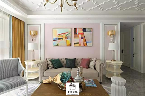 進(jìn)入客廳是淡粉色的墻面,搭配金色的窗簾,以及幾何的裝飾畫,來點綴空間從而使空間的色調(diào)更加的豐富。