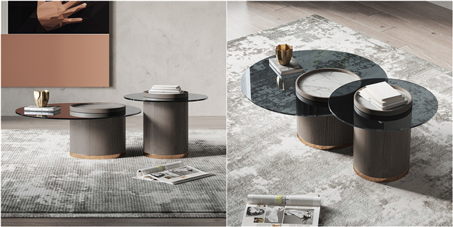 這套意式圓形茶幾打破傳統(tǒng)茶幾的形式,高低款式可以隨意組合,給人一種錯(cuò)落有致的美。茶幾最吸引我的部分就是桌面的設(shè)計(jì),兩種不同的材質(zhì)結(jié)合,給人一種獨(dú)特的美。