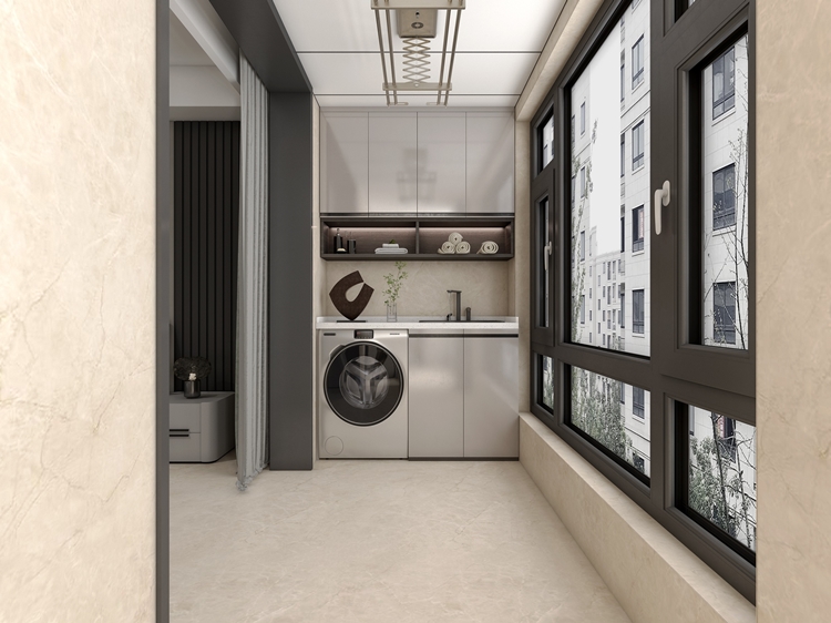 第五,陽(yáng)臺(tái)的一側(cè)做儲(chǔ)物柜,把你換季的鞋子衣服搞里頭,另一側(cè)做一個(gè)帶搓衣板的洗手池,夏天的小衣服手搓手洗很方便,提醒一下吊柜做到頂,這樣空間利用不浪費(fèi)。