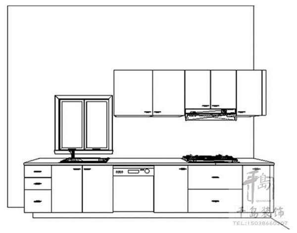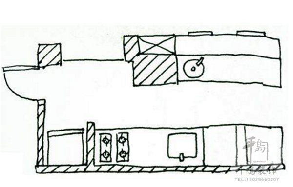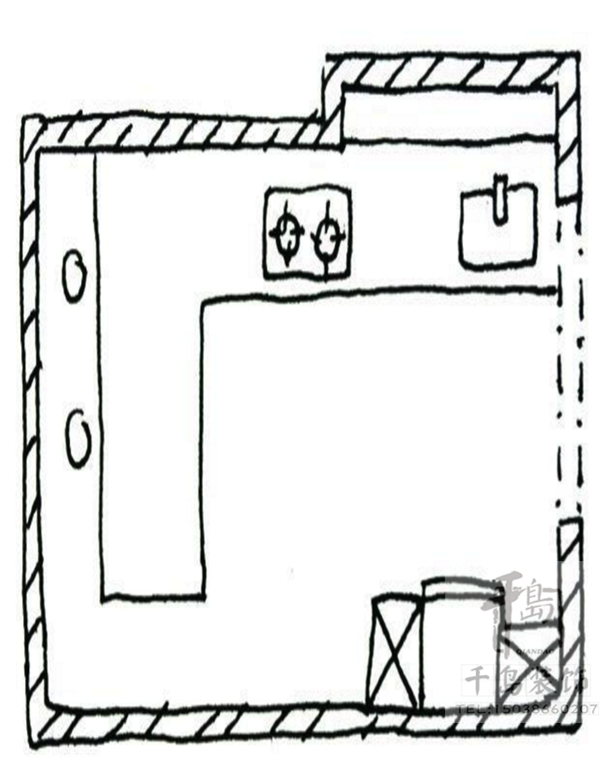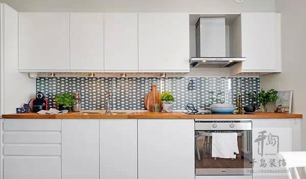廚具主要是沿著墻面一字排開,區(qū)域劃分的重點為冰箱-工作臺-洗滌區(qū)-處理區(qū)-烹飪區(qū)-用膳區(qū),佳空間長度大約為2公尺。由于空間的限制,櫥柜應(yīng)貼墻布置以適應(yīng)空間的特點和滿足功能的需求,烹飪用具不能過多,對櫥柜高度要仔細(xì)安置。