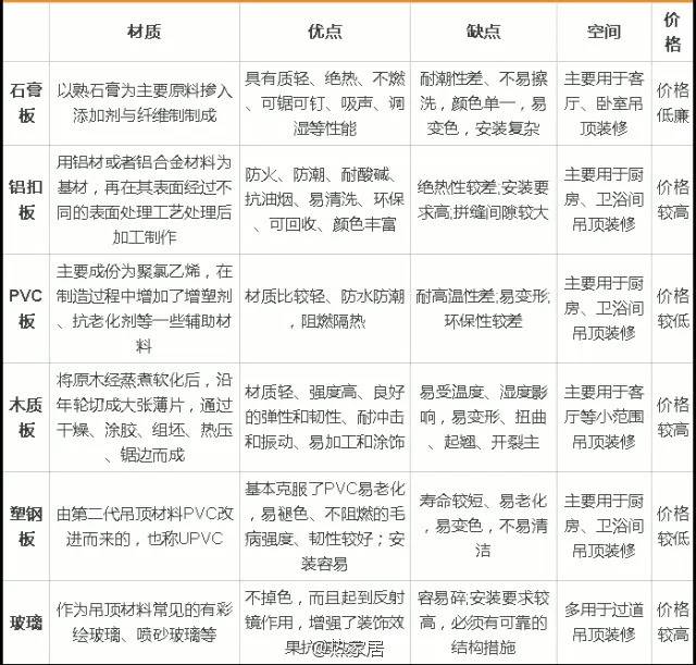 吊頂材料多種多樣,常見(jiàn)的材質(zhì)由石膏板、鋁扣板、PVC板、夾板、塑鋼板以及玻璃等。不同材質(zhì)的吊頂?shù)奶攸c(diǎn)、適用空間、價(jià)格等都有差別。